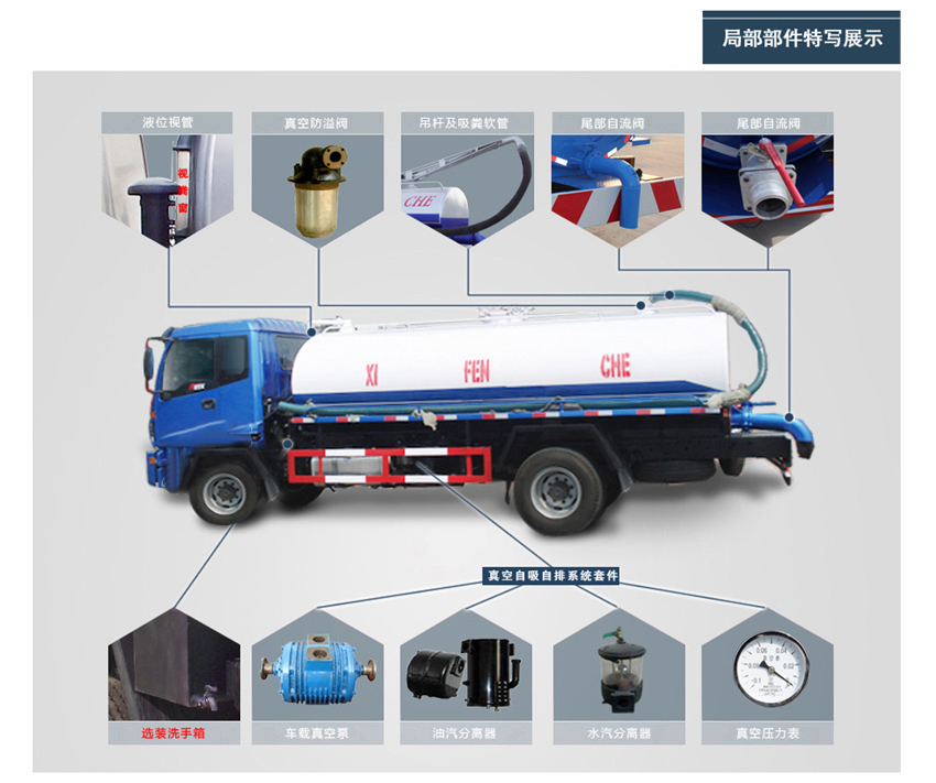 標(biāo)準(zhǔn): 吸糞車:專用部分由取力器、傳動(dòng)軸、真空吸污泵、水氣分離器、油氣分離器、多路換向閥、吊桿、糞罐、放糞閥、吸糞槍、清水箱、視糞窗、真空壓力表、管網(wǎng)系統(tǒng)等組成。