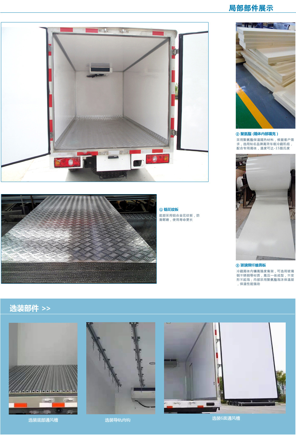 標(biāo)準(zhǔn): 冷藏機(jī)組有美國開利,冷王,韓國大廣,宇大,華泰,漢雪等全球知名品牌,內(nèi)外玻璃鋼,保溫層厚8CM,標(biāo)配三道導(dǎo)軌,可另選加裝導(dǎo)軌、肉鉤,可根據(jù)用戶要求設(shè)計隔艙及廂體開側(cè)門。