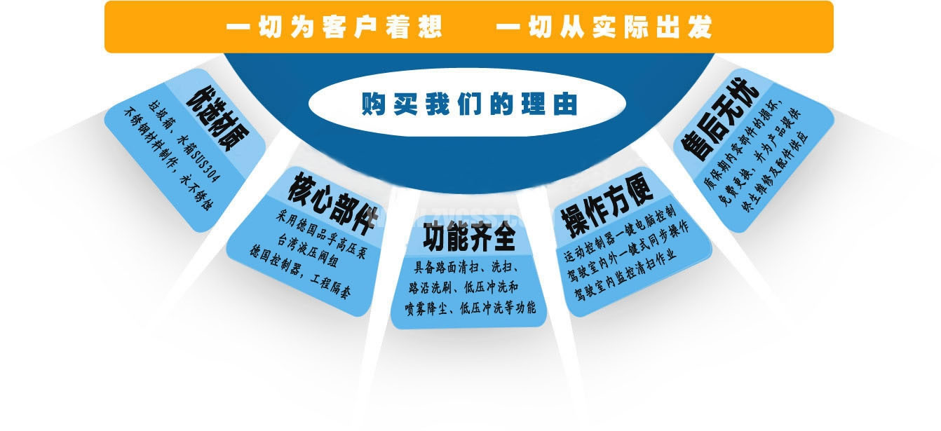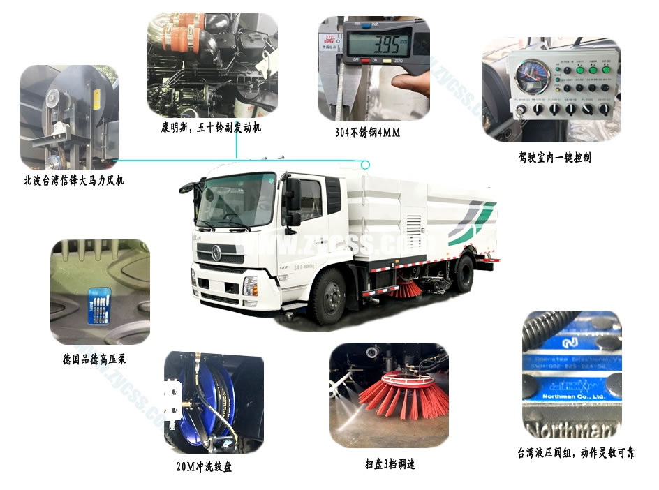 上裝配置: 1、帶2個中置掃盤;中置超寬吸嘴;雙層吸塵筒;康明斯170馬力副發(fā)動機;臺灣液壓閥;大力馬達;德國高壓水泵(前沖/側噴/中噴/后噴霧)/側沖洗水槍/垃圾箱自潔裝置);萬向高壓路沿清洗;威龍低壓泵(前沖),氣動球閥控制;4mm不銹鋼垃圾箱;不銹鋼水箱;德國控制器;尾部箭頭燈;機油、垃圾箱、水箱均帶防溢或低位報警裝置;倒車及洗掃狀態(tài)室內(nèi)監(jiān)視器;多種語音提示;倒車自動保護、防傾倒垃圾翻車保護、檢修安全保護;20m高壓沖洗卷盤;刷臂轉動機構使用德國進口高新耐磨工程隔套,免打黃油;精密冷彎無縫液壓油管;運動控制器一鍵電腦控制。 ![]() 產(chǎn)品功能特點